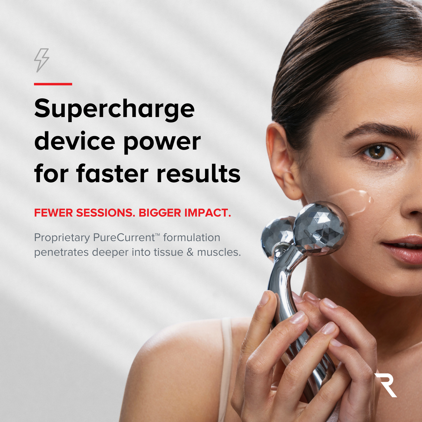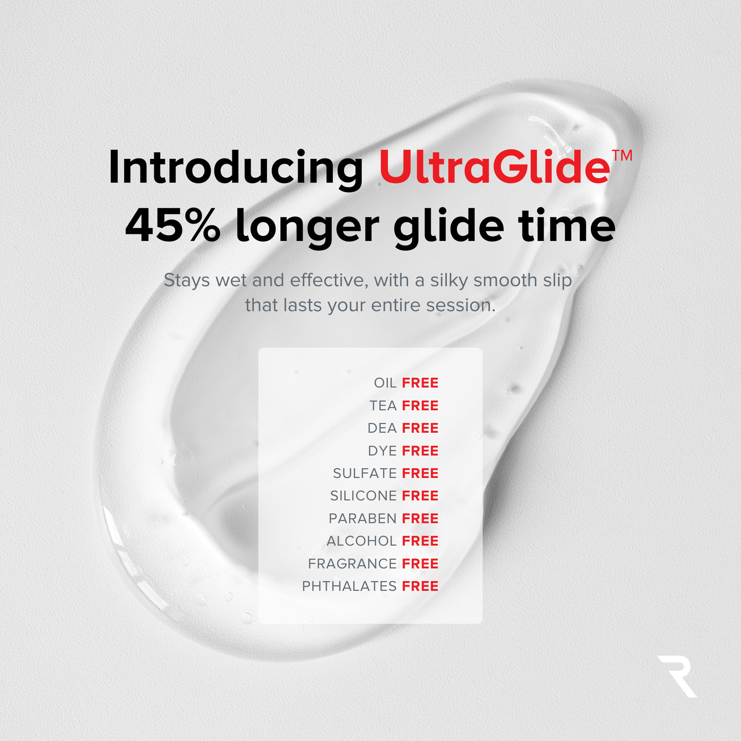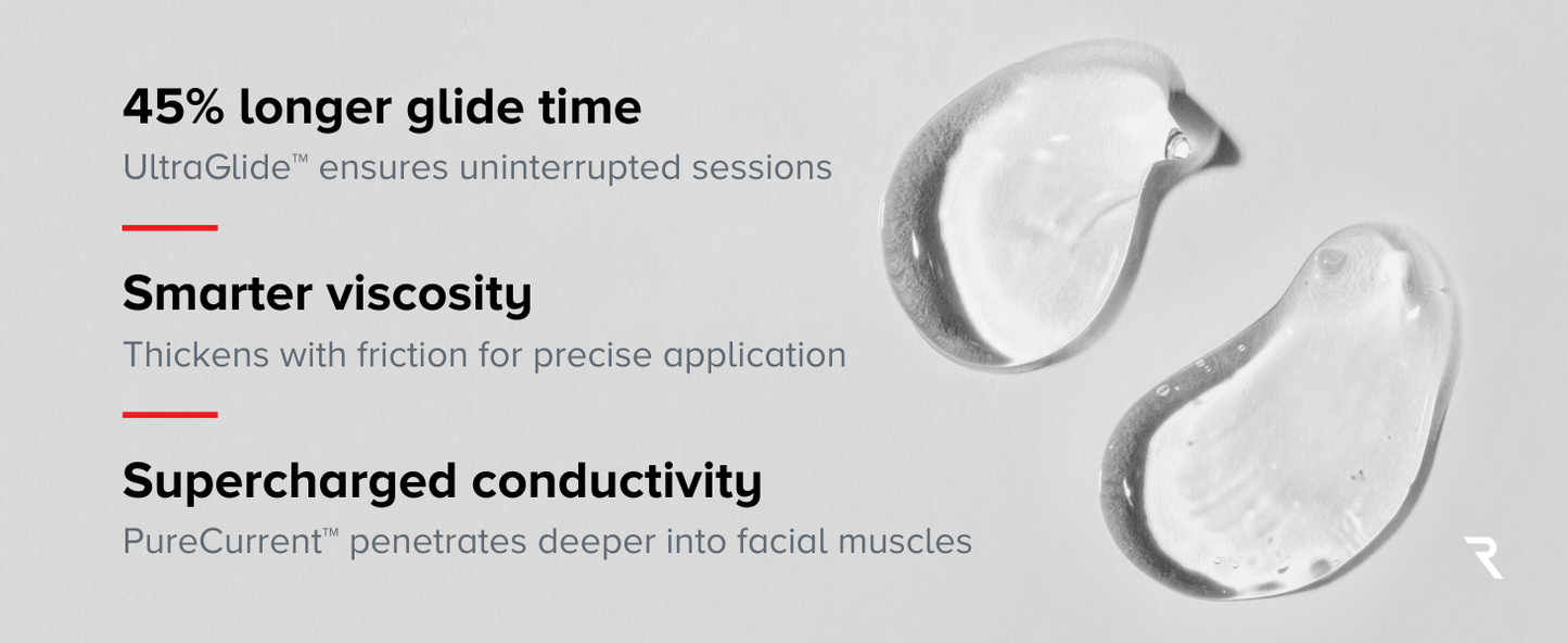UltraGlide technology graphic showing 45% longer glide time for microcurrent gel