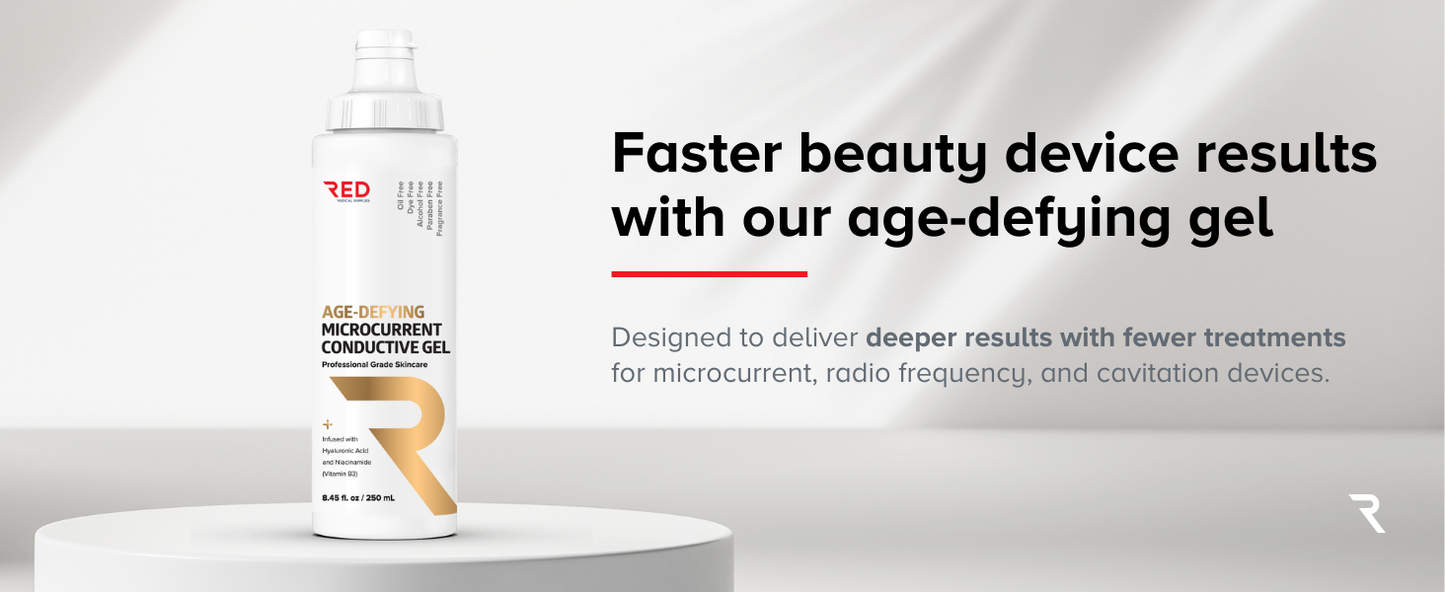 Bottle of AGE-DEFYING MICROCURRENT CONDUCTIVE GEL on a white background