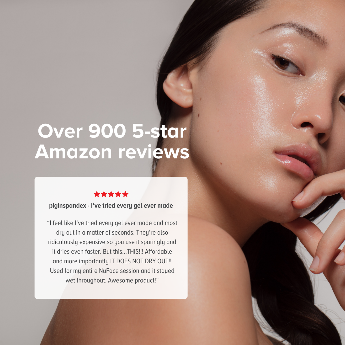 Model close-up with microcurrent conductive gel—over 900 five-star reviews graphic